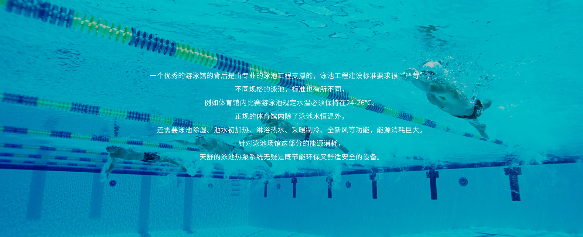 比賽游泳池對水溫要求較高,天舒泳池?zé)岜孟到y(tǒng)不僅能精確的控制水溫,而且相比傳統(tǒng)的加熱方式,可節(jié)約80%運(yùn)行費(fèi)用。